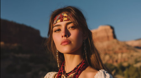 Young woman posing for a close up portrait, wearing traditional beaded accessories, reflecting her cultural identity and connection with the natural desert environment under a clear blue sky