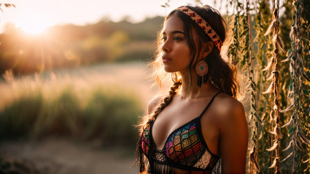 beautiful young woman in tribal costume outdoors portrait at sunset