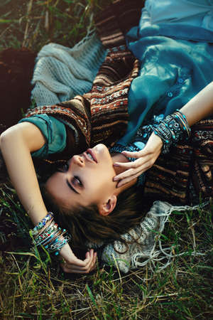 Beautiful hippie girl lying in a grass. Modern boho style. Beauty, fashion,