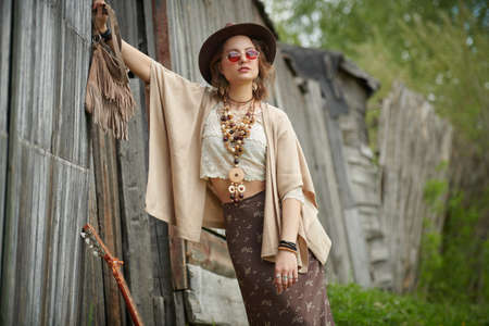 Fashion shot. Portrait of a beautiful young woman model posing in boho style clothes and jewelry by an old wooden fence in the countryside. Summer style, vacation.