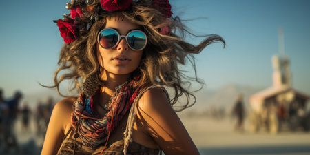 A vivid portrait of an eccentric Burning Man attendee - an embodiment of creativity and liberated self-expression amidst the festival ambiance. AI Generative AI