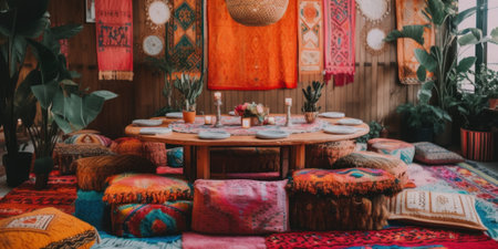 A room filled with lots of colorful pillows and rugs. AI generative image.