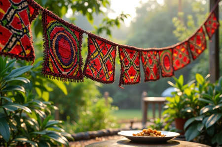 Juneteenth Colorful tribal decorations outdoors with hanging red patterns in sunlit garden. That the image is generated using AI.