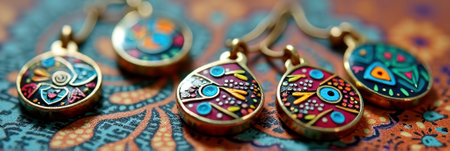 Colorful bohemian earrings on vibrant patterned background. That the image is generated using AI.