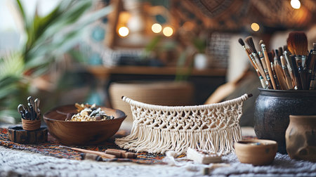 A bohemian setup featuring yarn, fabric, and traditional crafts, arranged on a textured surface with rich colors.