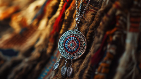 A close-up image of a silver dreamcatcher pendant featuring delicate feathers, captured against a colorful textile background, showcasing craftsmanship and design.