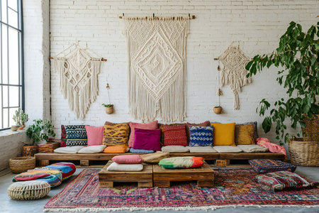 A bohemian-style lounge area with macramé wall hangings, colorful cushions, and low wooden seating, created by ai