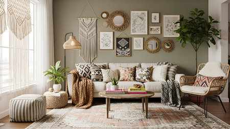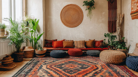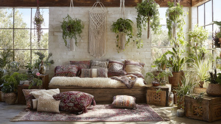 A serene bohemian living room features a cozy seating area adorned with colorful cushions, lush plants, and macrame decor, all bathed in soft natural light.