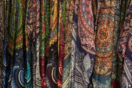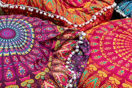 Bright colorful handmade ethnic traditional pillows background selling on a local asian market.