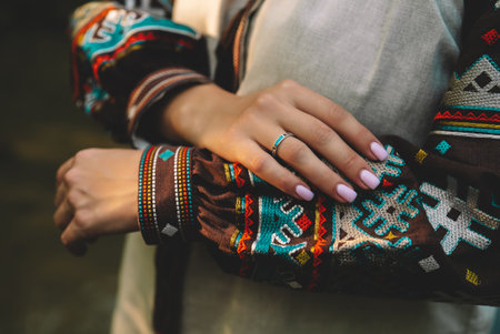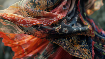 Vibrant traditional textiles with intricate embroidery and colorful patterns. That the image is generated using AI.
