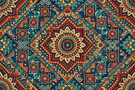 Cinematic texture of intricate tribal patterns with rich colors and designs