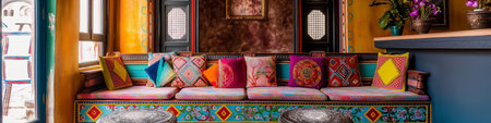 Colorful Traditional Lounge with Ornate Decor and Cozy Seating.