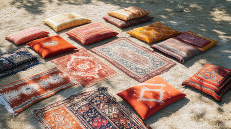A vibrant display of colorful textiles and cushions arranged on natural ground. This arrangement showcases intricate patterns, textures, and craftsmanship, creating a cozy and inviting atmosphere.