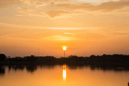 Silhouette of Palm tree at sunset landscape. Golden sun sunset reflect on the water in field meadow at evening day.