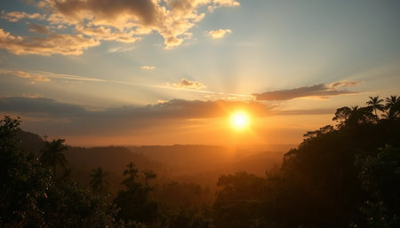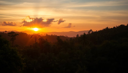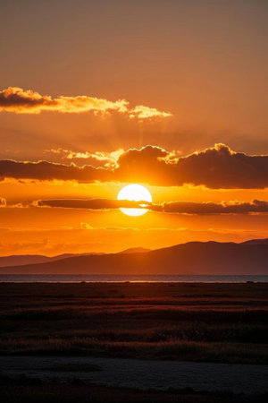 This stunning sunset showcases a warm orange glow over rolling hills, creating a tranquil atmosphere perfect for nature lovers and landscape photography enthusiasts.