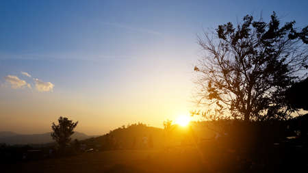 capture moment beautiful sunrise on horizontal line of mountain for waking new day with sillhouette of tree with vintage tone style