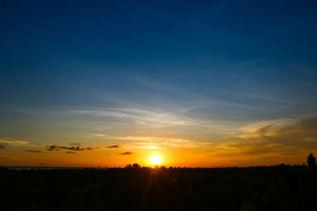 Natural Sunset Sunrise Over Field Or Meadow. Bright Dramatic Sky And Dark Ground. Countryside Landscape Under Scenic Colorful Sky At Sunset Dawn Sunrise. Sun Over Skyline, Horizon. Warm Colours.
