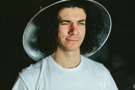 a guy in a cap 21-23 years old model looks smiling at the camera, portrait closeup.