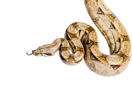 Closeup of a Boa snakes face isolated on white against a bright studio copyspace background. Head of a slithering snake kept as a pet with copy space. Waiting on the floor, calm and ready to attack