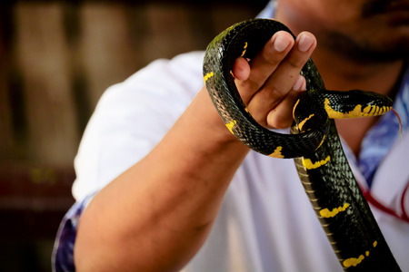 Cute mangrove snake on hand of the expert. Boiga dendrophila, commonly called the mangrove snake or the gold-ringed cat snake, is a species of rear-fanged snake in the family Colubridae.