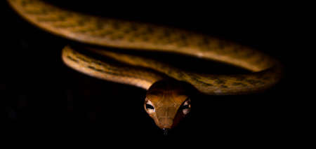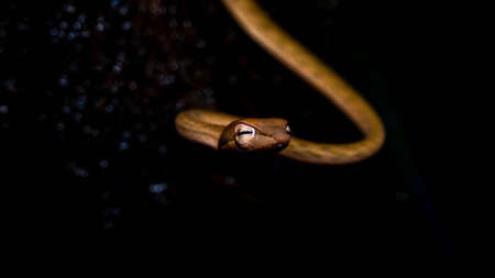 Brown Asian Vine snake found in Borneo forest. Brown Asian whip snake on dark background