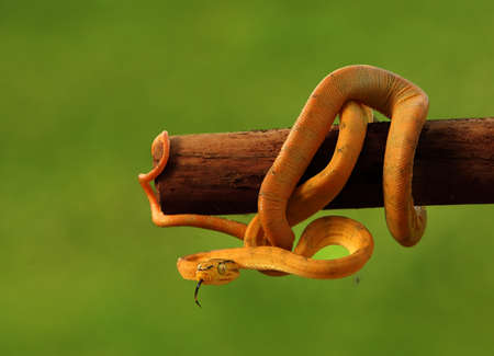 Profile of a green and angry viper on a trunk in the Amazon jungle