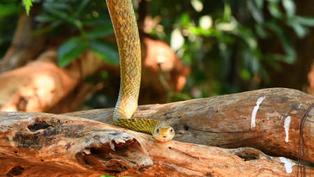 Cute Indochinese rat snake (Ptyas korros) is slithering on tree with green leaves background. Chinese ratsnake or Indo-Chinese rat snake, is a species of colubrid snake endemic to Southeast Asia.