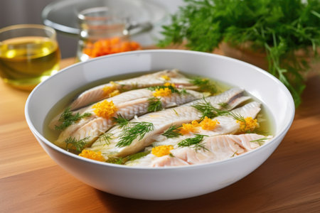 freshly marinated fish sitting in a light-colored bowl, created with generative ai