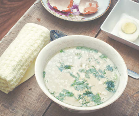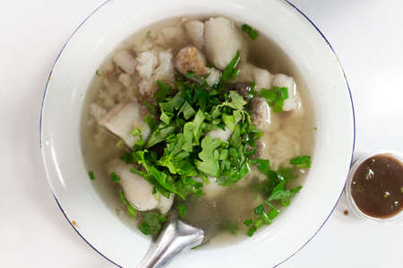 Top view of Thai rice soup with fish served in an originally coated steel bowl.
