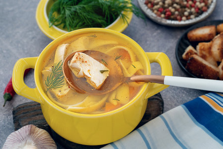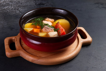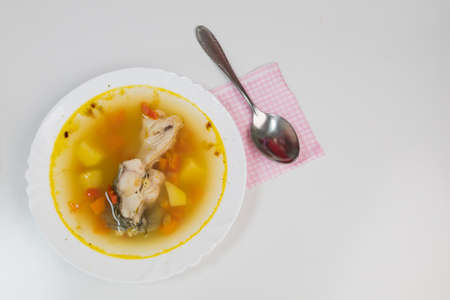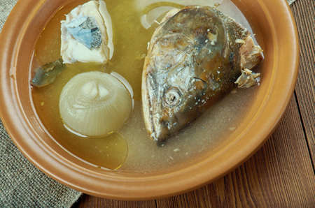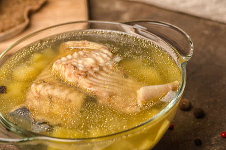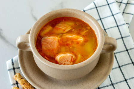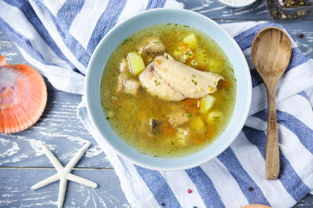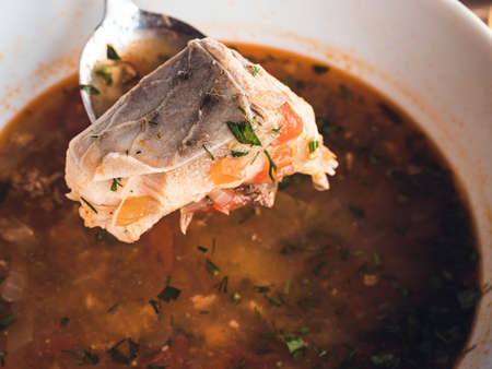 Fish soup is a traditional dish for coastal residents. Home cooking or culinary background abstract. Homemade dish.