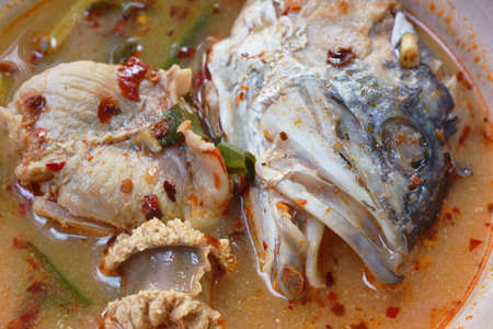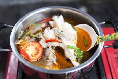 spicy boiled bass fish and head in tom yum soup on bowl