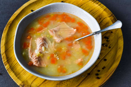 Salmon fish soup. Culinary background with selective focus and blurred background.