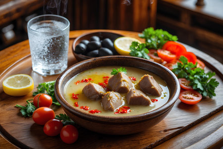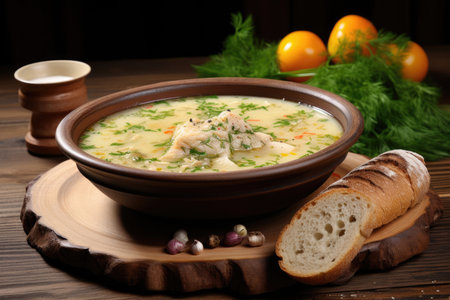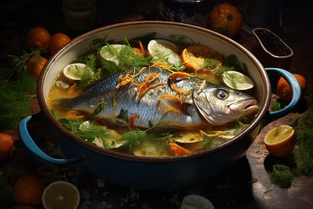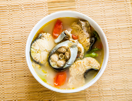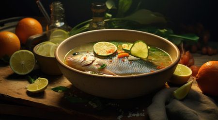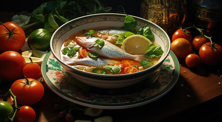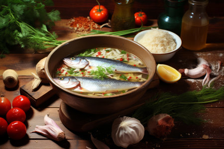 fish soup in bowl and on a table