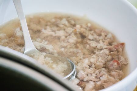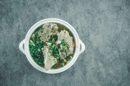 Thai food style, hot and spicy pork neck bones soup in white bowl, This food is most popular Thai food, Lang Zap or Tom Yam is Thai traditional