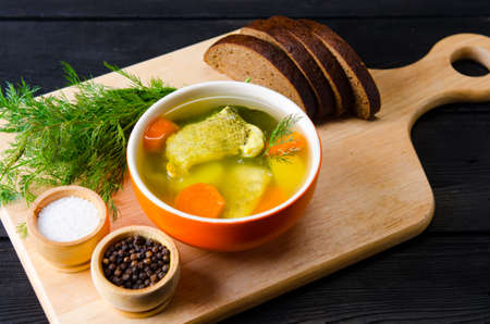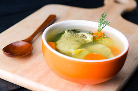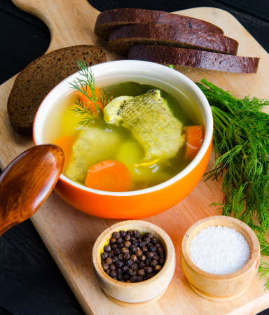 Soup with fish slices and herbs in a deep dish