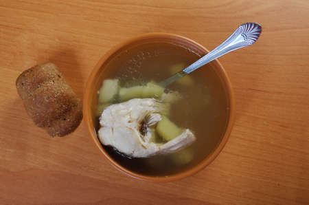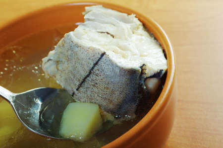 Fish soup with potato on the wooden table