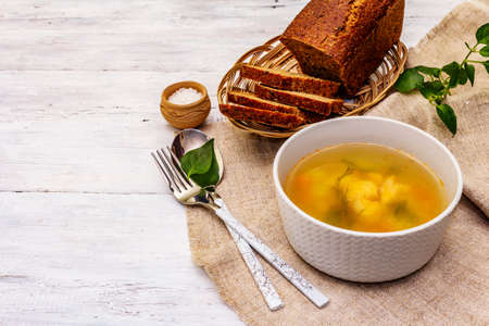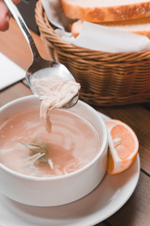 chicken soup in a bowl on a wooden background. tinting. selective focus