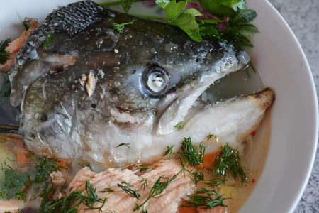 Trout fish head on a plate of fish soup close-up on a plate. Fish mouth open, clear eyes