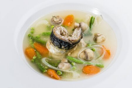Fish soup with mackerel and vegetables. On a white background