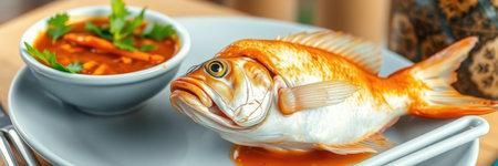 A whole cooked fish and a bowl of red soup are served on a plate