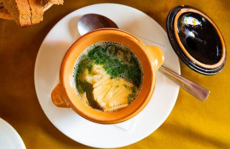 Fish soup served on the table in plate