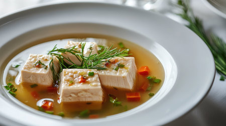 Close-up of delicious and comforting fish meatball soup, seasoned with chopped scallions and chili peppers, served in a bowl