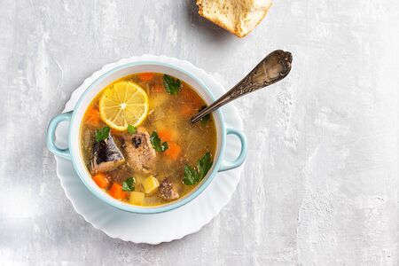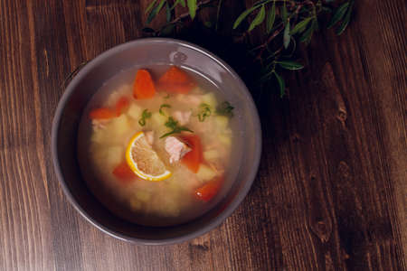 Fish soup with potatoes and carrots, on a concrete background with a slice of lemon and herbs