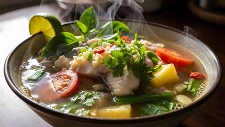 A steaming bowl of clear fish soup, featuring chunks of white fish, tomato slices, and fresh herbs. A lime wedge sits on the rim of the bowl, suggesting a sour and savory flavor profile typical of Asian cuisine.