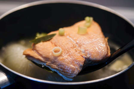 Boiled salmon fillet in boiling water, add lemongrass and kaffir lime leaves