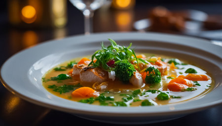 fish soup with vegetables and herbs in a bowl