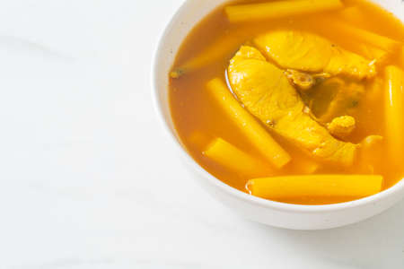 spicy bass fish head and slice coconut shoot in Tom Yum soup on plate