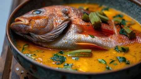 A mouthwatering fish dish featuring a whole fish cooked in a rich, aromatic broth. Garnished with fresh basil and strips of ginger, it sits elegantly in a stylish bowl on a wooden table.