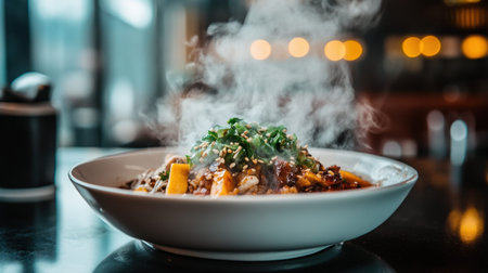 A steaming bowl of fresh noodle dish garnished with herbs and spices, showcasing culinary artistry. Perfect for food enthusiasts and chefs alike.
