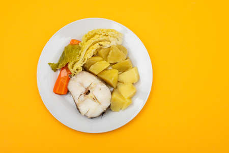 boiled fish with boiled potato, carrot and cabbage on white dish